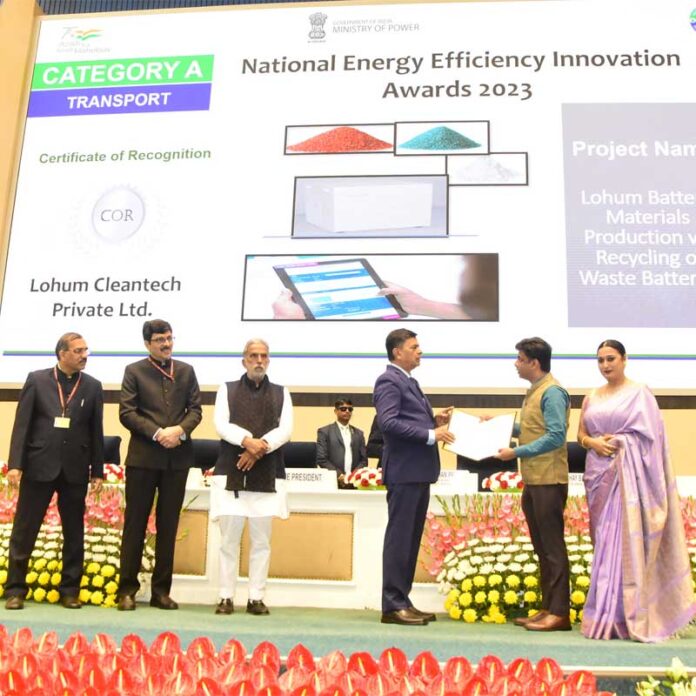 Union Minister of Power Shri RK Singh on National Energy Conservation Day 2023 felicitated LOHUM with India’s National Energy Efficiency Innovation Award (NEEIA), in the presence of Hon’ble President Smt. Droupadi Murmu as Chief Guest. The NEEIA 2023 was awarded to LOHUM for an industry-leading project on ‘Battery Materials Production via Recycling of Waste Batteries’ in the Transport category.