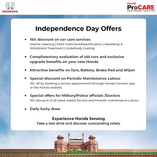 In a gesture of gratitude towards Defense personnel, Police Officials, and Doctors, Honda is extending special offers on all Value-Added Services and Periodic Maintenance Labour, as a token of appreciation for their dedicated service. Moreover, the Independence Day Camp will feature a Daily Lucky Draw, offering participants the chance to win exciting prizes.