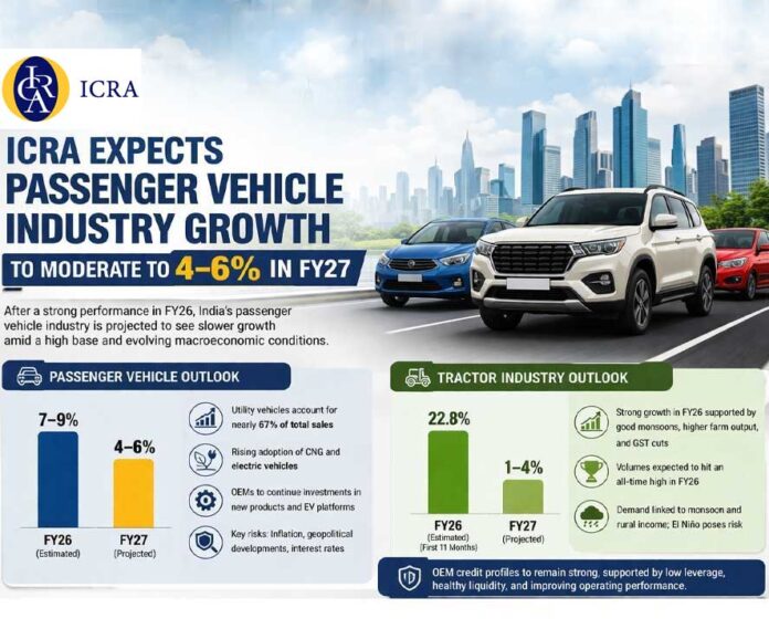 ICRA forecasts moderation in India’s passenger vehicle and tractor industry growth in FY27, citing high base effect, macroeconomic factors and monsoon risks.