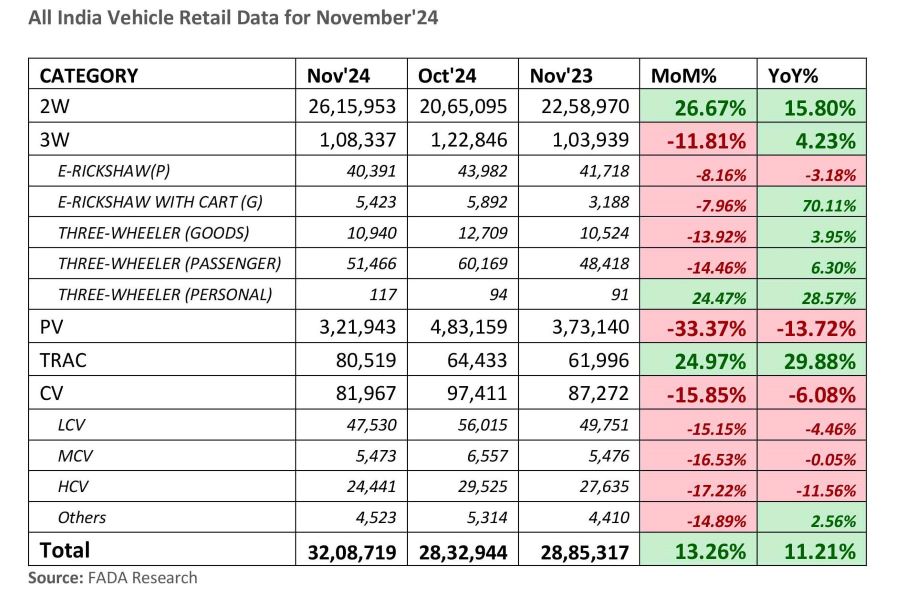 India’s auto retail sector showed a mixed performance across segments in November 2024, according to FADA’s latest report. Year-over-Year (Y-o-Y) sales rose for Two-Wheelers (2W), Three-Wheelers (3W), and Tractors (Trac), with growth rates of 15.8%, 4.23%, and 29.88%, respectively. However, Passenger Vehicles (PV) and Commercial Vehicles (CV) faced Y-o-Y declines of 13.72% and 6.08%.