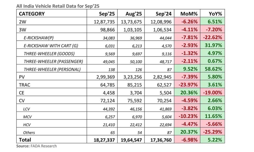 India’s vehicle retail sales grew by 5.22% year-on-year in September 2025, reaching 18,27,337 units compared to 17,36,760 units in September 2024, according to data released by the Federation of Automobile Dealers Associations (FADA) on Tuesday.