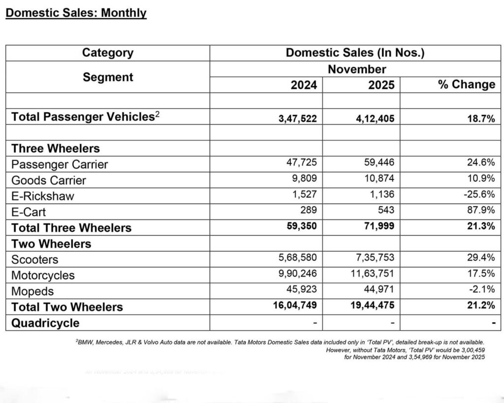 Domestic passenger vehicle sales rose 18.7 per cent year-on-year (YoY) to 4,12,405 units, marking the best November on record for the segment. Utility vehicles continued to anchor demand, while passenger cars and vans also posted robust double-digit growth in both production and exports.