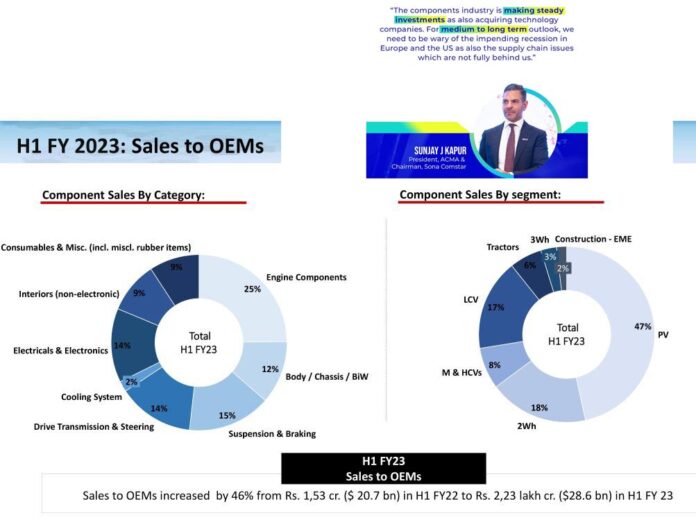 Sharing his insights on the performance of the auto component industry, Sunjay Kapur, President, ACMA Chairman, Sona Comstar said, “With vehicle sales across all segments, reaching the pre-pandemic levels and moderation in the supply-side issues such as availability of semiconductors, high input raw-material costs and non-availability of containers, the auto components sector witnessed a steady growth in both domestic and the international markets in the first half of FY2022-23. With domestic manufacturing of vehicles and components gathering pace, imports also witnessed an uptick.”