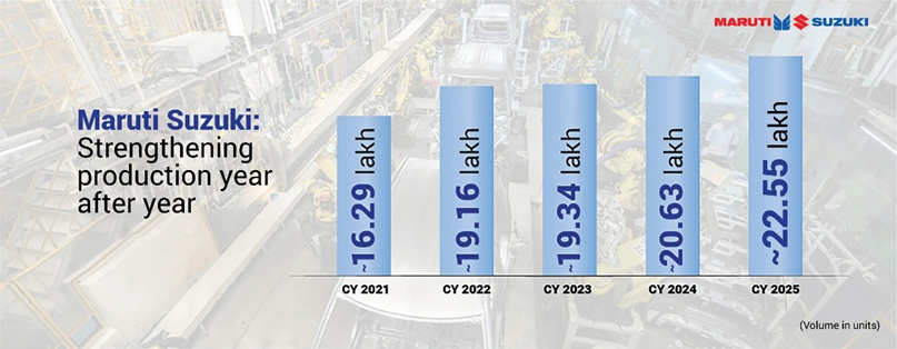 Maruti Suzuki India Limited has achieved its highest-ever annual production, manufacturing over 22.55 lakh vehicles in calendar year 2025. This marks the second consecutive year in which the company has surpassed the 20 lakh unit production milestone, underscoring its sustained manufacturing strength.