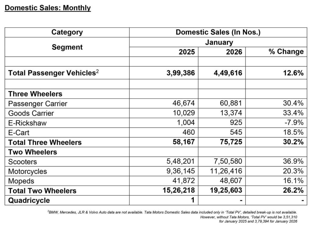 Passenger vehicle sales rose 12.6 per cent year-on-year to 4,49,616 units in January 2026, compared with 3,99,386 units in the same month last year. Three-wheeler sales grew sharply by 30.2 per cent to 75,725 units, while two-wheeler sales increased 26.2 per cent to 19,25,603 units.