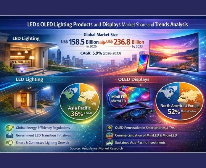 According to a recent analysis published by Persistence Market Research, the global LED and OLED lighting products and displays market is projected to reach approximately US$ 158.5 billion in 2026 and expand further to around US$ 236.8 billion by 2033. This trajectory reflects a compound annual growth rate of 5.9% during the forecast period from 2026 to 2033. The market’s expansion is being driven less by short-term demand spikes and more by structural forces such as tightening energy-efficiency regulations, large-scale LED transition programs supported by governments, and the continuous replacement of traditional lighting with smart, connected systems.